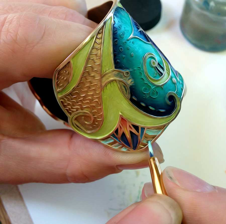 After a successful 25-year career in branding and corporate marketing, she found herself restless and sought new ways to express her artistic vision. In 2011, she experimented with intricate bead work, transitioned to the hypnotic experience of lampworking glass, and then began an exploration into metal in 2013. That journey led to a discovery and harmony she has achieved with a combination of technology and her signature organic forms. Inspired by fairy tales, fantasy and mysticism, each Champlevé piece is hand-painted and protected by resin, and hints at her love of oil painting.